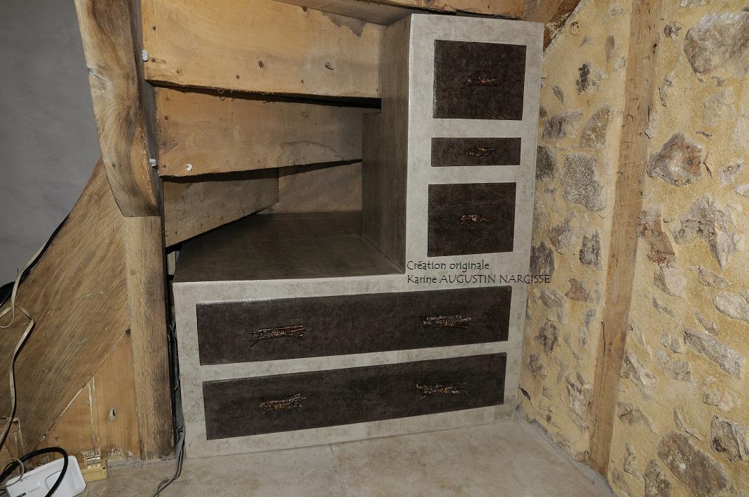 Chouette en papier roulé posée sur un socle en bois et branchages.