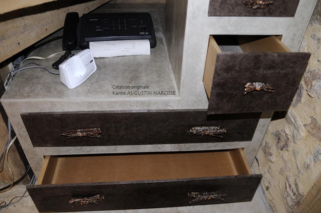 Meuble à chaussures sous escalier - déco papier mûrier et poignées création originale fagots de bois, perles et fil de fer